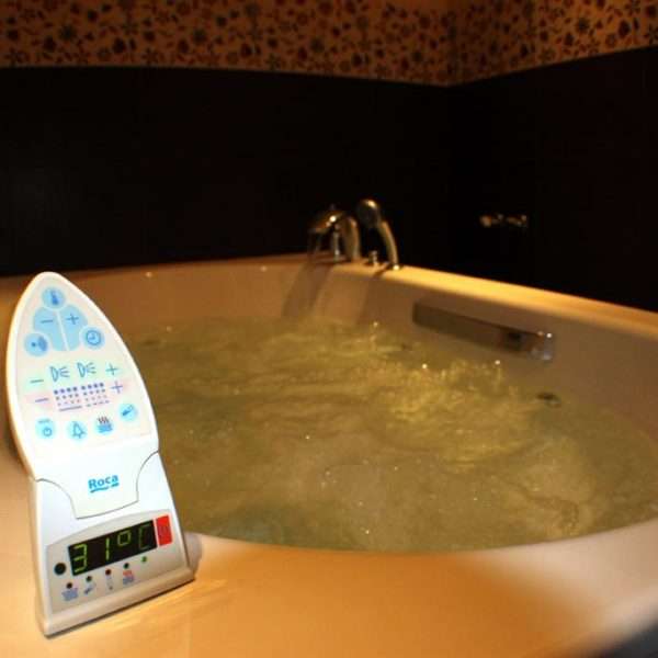Detail of suspended furniture, with independent lighting. Right: Backlit makeup vanity mirror (folded against the wall). Useful area: 9.82 m2. Air conditioning: underfloor heating only. Hydromassage cabin, screen with sliding angular opening and Jacuzzi bathtub