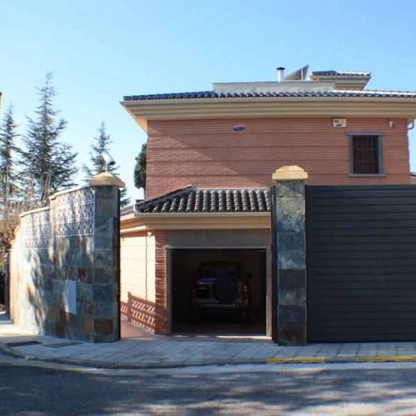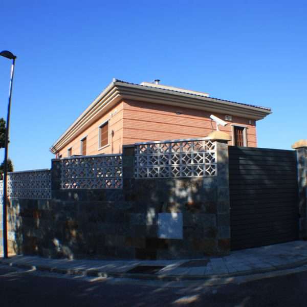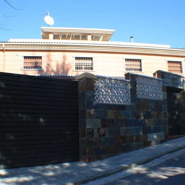 Photography from Mistral Street, towards the west. Up and over doors closed. Most of the house is hidden from view, due to the slope of the land and the height of the boundary. System of security cameras installed in studied areas to be able to observe and control all areas of the house.
